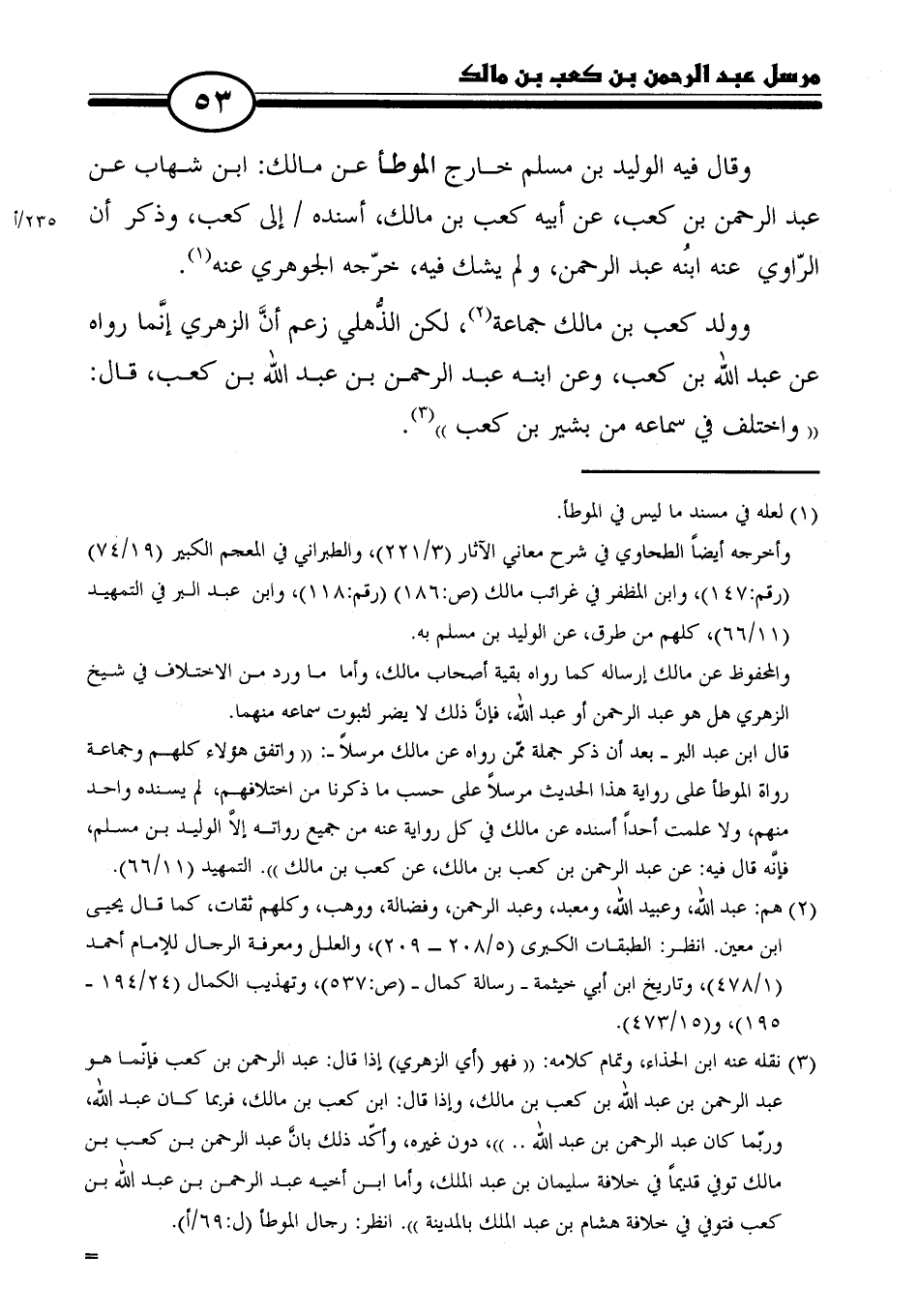 (٣) نقله عنه ابن الحذاء، وتمام كلامه: "فهو (أي الزهري) إذا قال: عبد الرحمن بن كعب فإنّما هو عبد الرحمن بن عبد الله بن كعب بن مالك، وإذا قال: ابن كعب بن مالك، فربما كان عبد الله، وربّما كان عبد الرحمن بن عبد الله. ."، دون غيره، وأكّد ذلك بأنَّ عبد الرحمن بن كعب بن مالك توفي قديمًا في خلافة سليمان بن عبد الملك، وأما ابن أخيه عبد الرحمن بن عبد الله بن كعب فتوفي في خلافة هشام بن عبد الملك بالمدينة". انظر: رجال الموطأ. =
