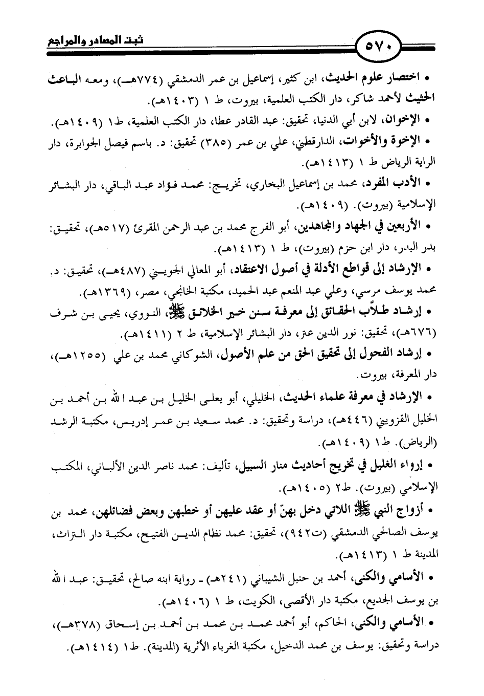 * الإرشاد في معرفة علماء الحديث، الخليلي، أبو يعلى الخليل بن عبد الله بن أحمد بن الخليل القزويني (٤٤٦ هـ)، دراسة وتحقيق: د. محمد سعيد بن عمر إدريس، مكتبة الرشد (الرياض). ط ١ (١٤٠٩ هـ).