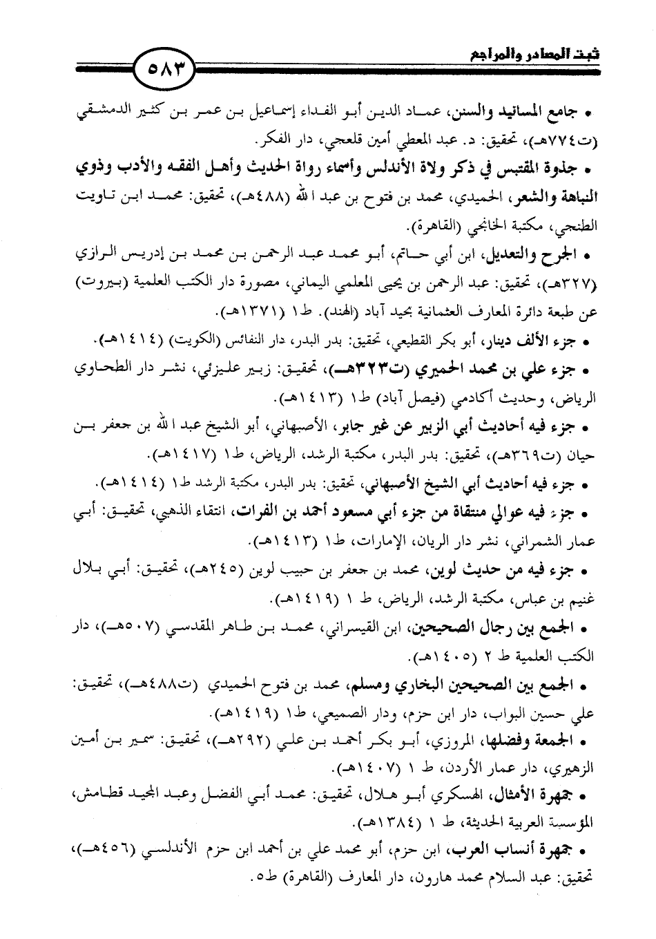 * الجمع بين الصحيحين البخاري ومسلم، محمد بن فتوح الحميدي (ت ٤٨٨ هـ)، تحقيق: علي حسين البواب، دار ابن حزم، ودار الصميعي، ط ١ (١٤١٩ هـ).