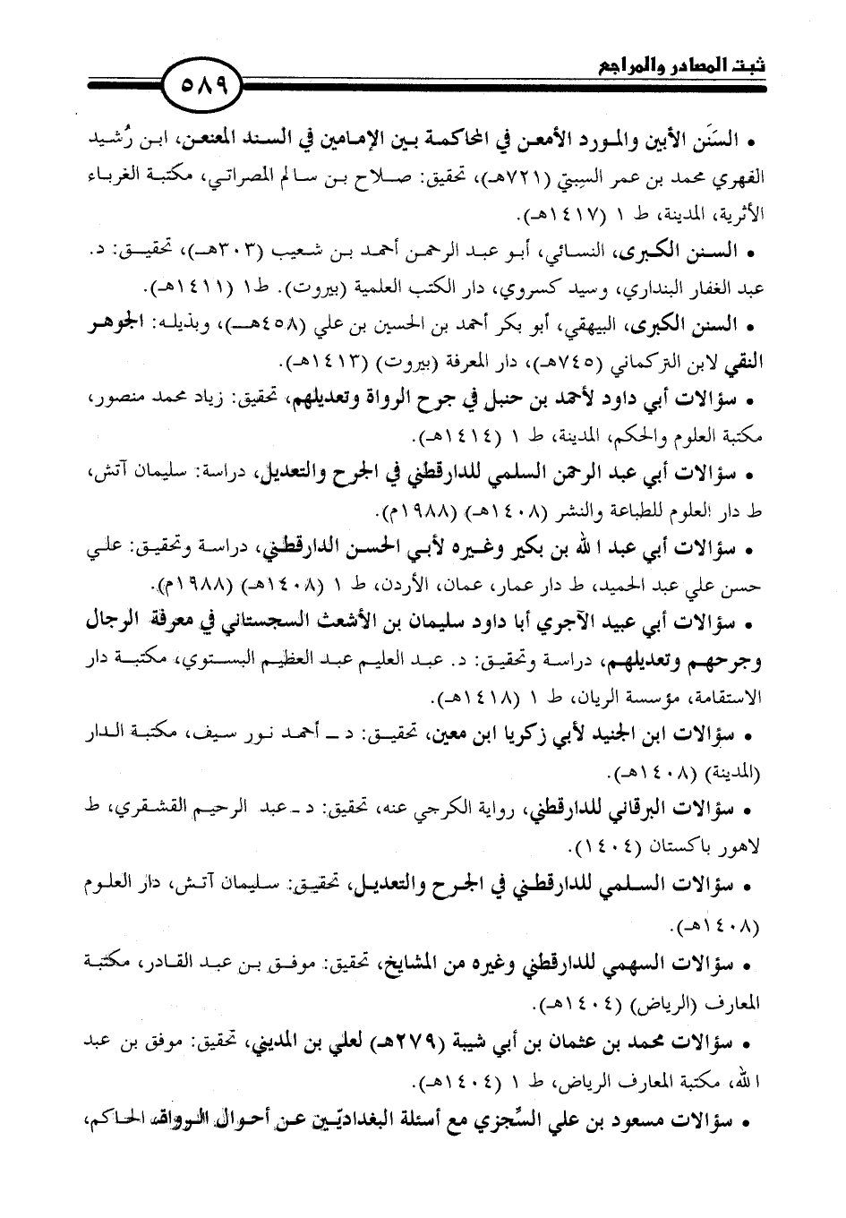 * السَنَن الأبين والمورد الأمعن في المحاكمة بين الإمامين في المسند المعنعن، ابن رُشيد الفهري محمد بن عمر السِبتي (٧٢١ هـ)، تحقيق: صلاح بن سالم المصراتي، مكتبة الغرباء الأثرية، المدينة، ط ١ (١٤١٧ هـ).