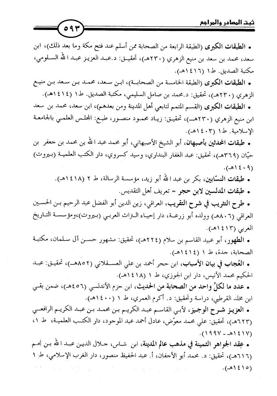 * طبقات المحدثين بأصبهان، أبو الشيخ الأصبهاني، أبو محمد عبد الله ين محمد بن جعفر بن حيّان (٣٦٩ هـ)، تحقيق: عبد الغفار البنداري، وسيد كسروي، داو الكتب العلمية (بيروت) (١٤٠٩ هـ).