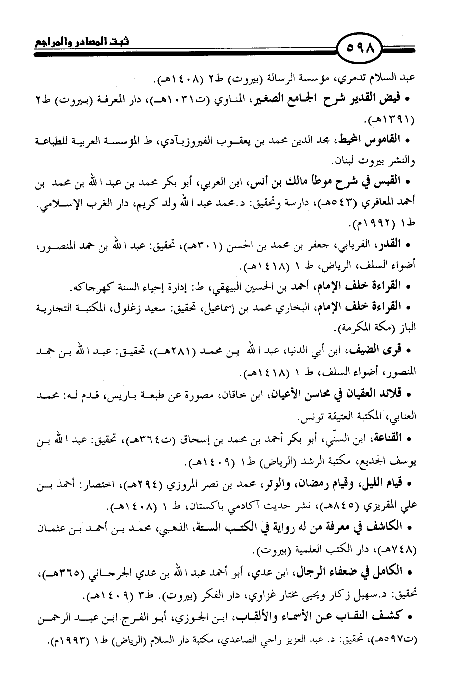 * فيض القدير شرح الجامع الصغير، المناوي (ت ١٠٣١ هـ)، دار المعرفة (بيروت) ط ٢ (١٣٩١ هـ).