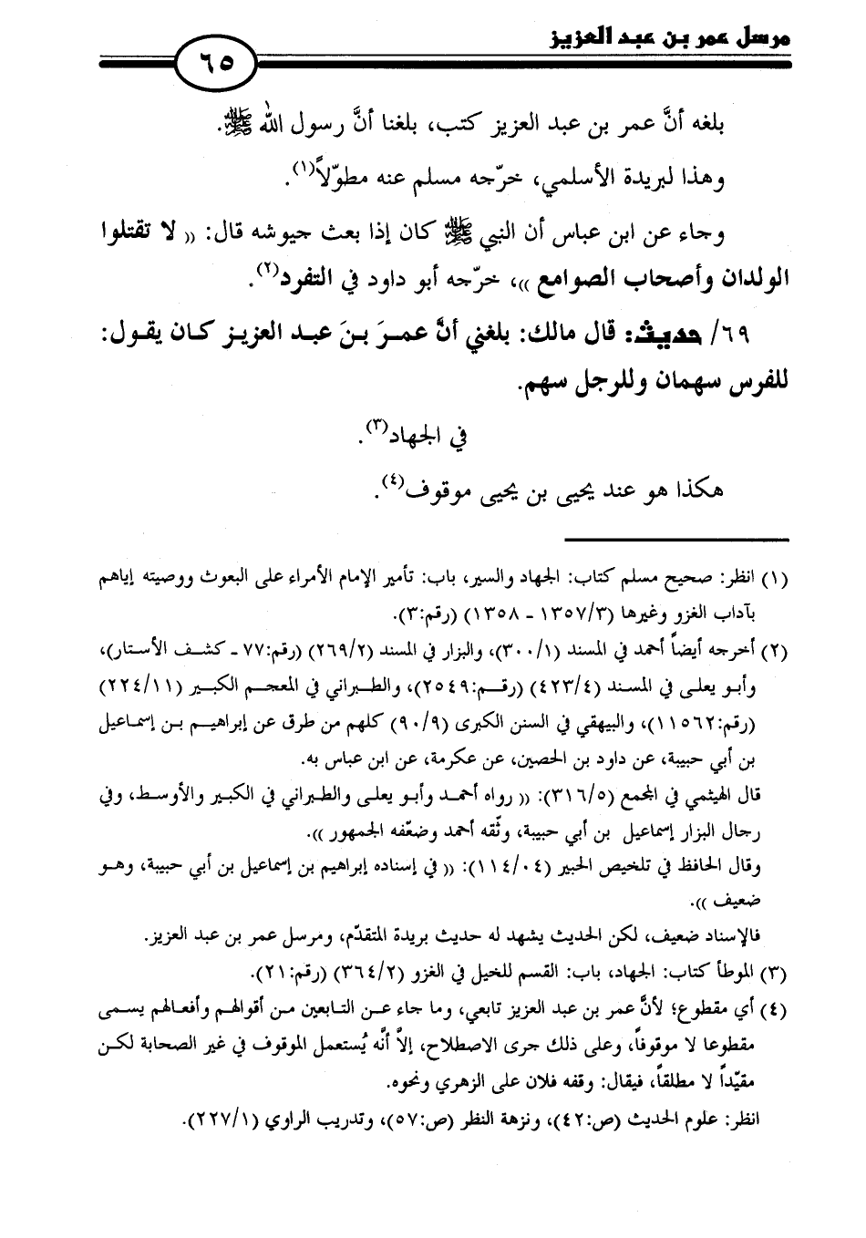 ٦٩ / حديث: قال مالك: بلغني أن عمرَ بنَ عبد العزيز كان يقول: للفرس سهمان وللرجل سهم.