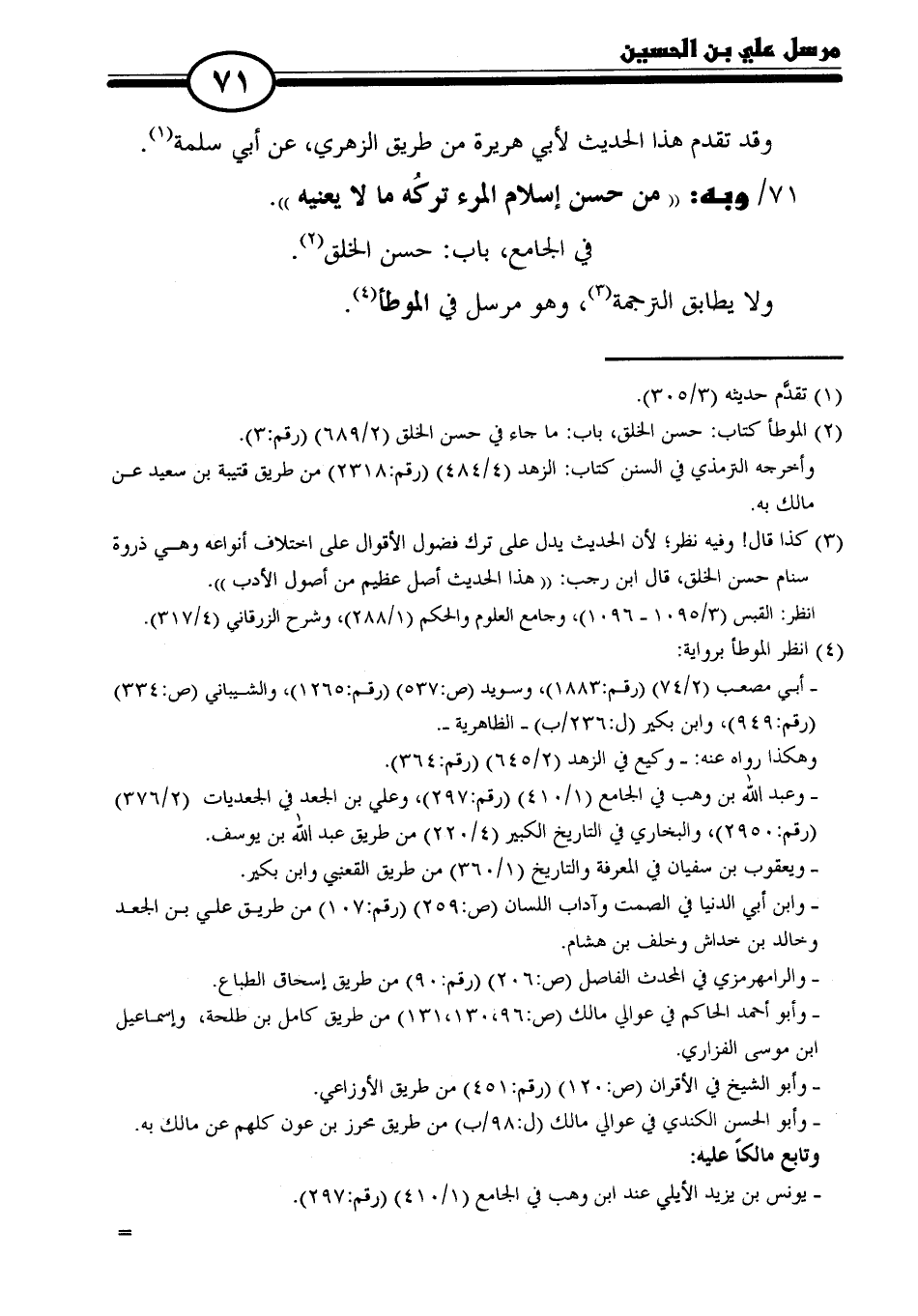 ٧١ / وبه: "من حسن إسلام المرء تركُه ما لا يعنيه".