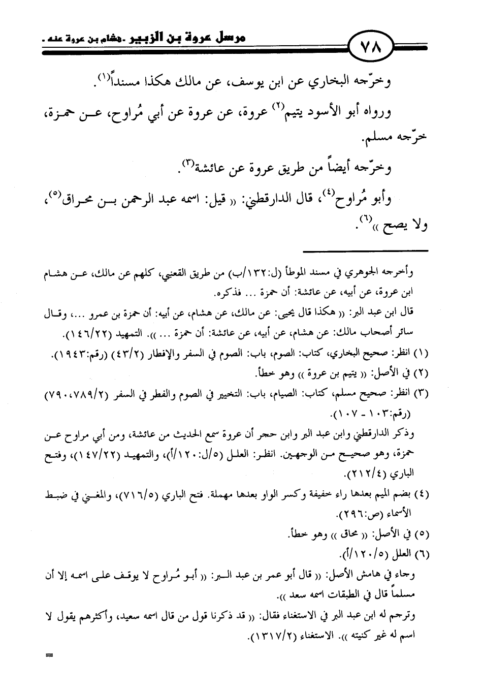 وذكر الدارقطني وابن عبد البر وابن حجر أن عروة سمع الحديث من عائشة، ومن أبي مراوح عن حمزة، وهو صحيح من الوحهين. انظر: العلل (٥ / ل: ١٢٠ / أ)، والتمهيد (٢٢/ ١٤٧)، وفتح الباري (٤/ ٢١٢).