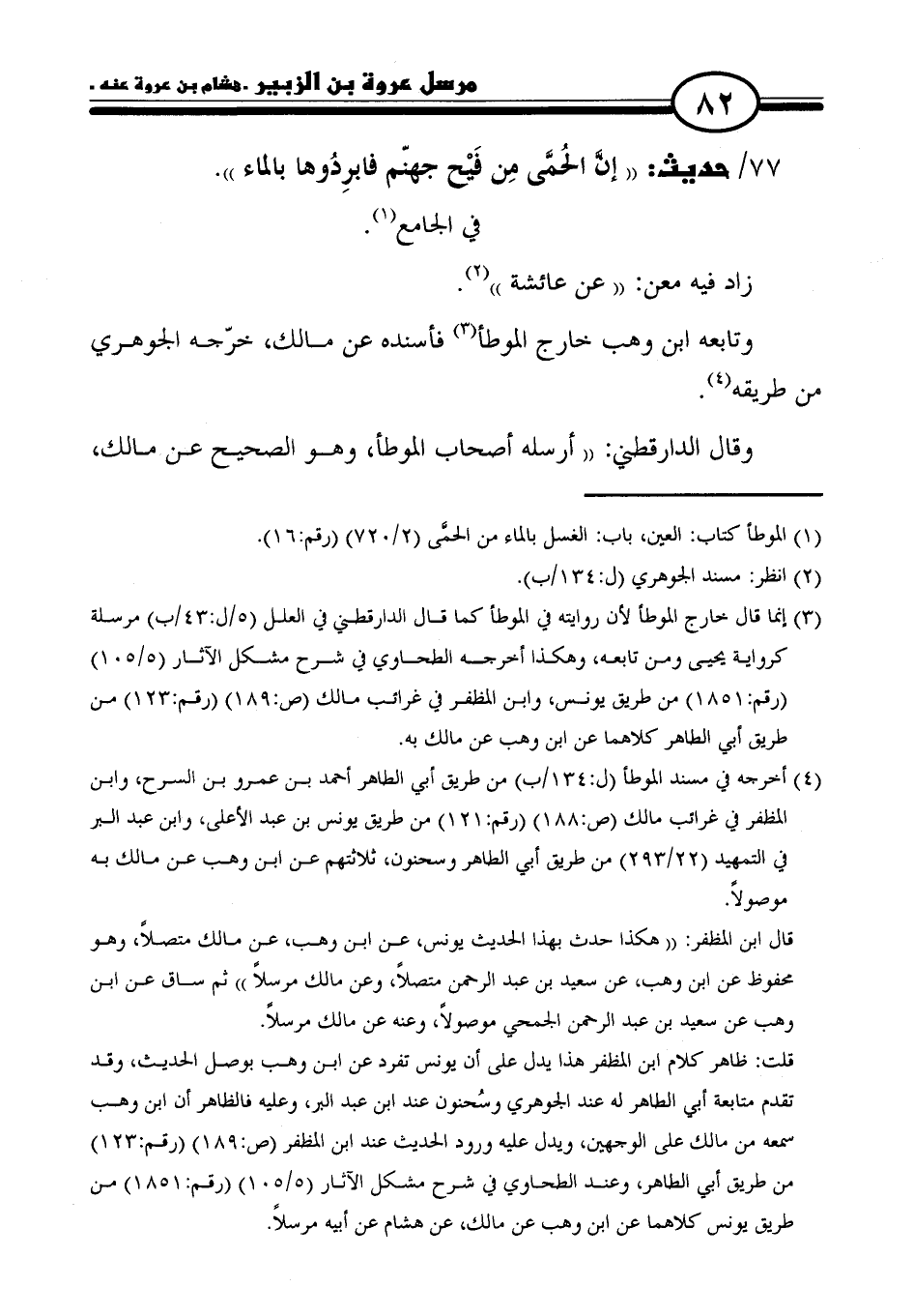 (٤) أخرجه في مسند الموطأ (ل: ١٣٤ / ب) من طريق أبي الطاهر أحمد بن عمرو بن السرح، وابن المظفر في غرائب مالك (ص: ١٨٨) (رقم: ١٢١) من طريق يونس بن عبد الأعلى، وابن عبد البر في التمهيد (٢٢/ ٢٩٣) من طريق أبي الطاهر وسحنون، ثلاثتهم عن ابن وهب عن مالك به موصولا.