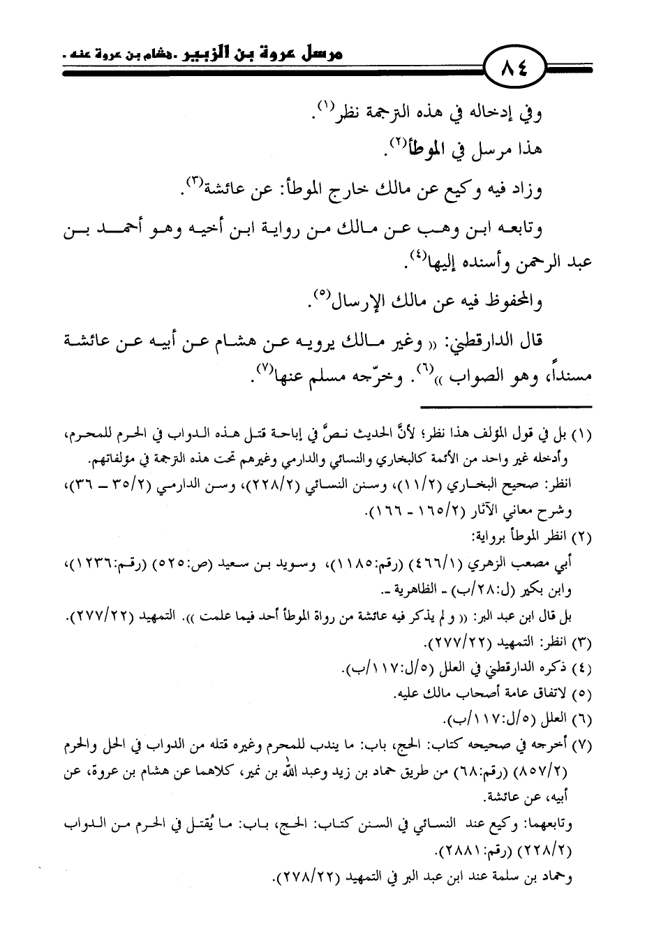 (٧) أخرجه في صحيحه كتاب: الحج، باب: ما يندب للمحرم وغيره قتله من الدواب في الحل والحرم (٢/ ٨٥٧) (رقم: ٦٨) من طريق حماد بن زيد وعبد الله بن نمير، كلاهما عن هشام بن عروة، عن أبيه، عن عائشة.