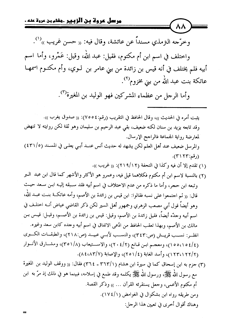 (٣) جزم به ابن إسحاق كما في سيرة ابن هشام (١/ ٣٦٣ - ٣٦٤) فقال: "ووقف الوليد بن المغيرة مع رسول الله - صلى الله عليه وسلم -، ورسول الله - صلى الله عليه وسلم - يكلمه وقد طمع في إسلامه، فبينما هو في ذلك إذ مرّ به ابن أم مكتوم الأعمى، وجعل يستقرئه القرآن ... " وذكر القصة.