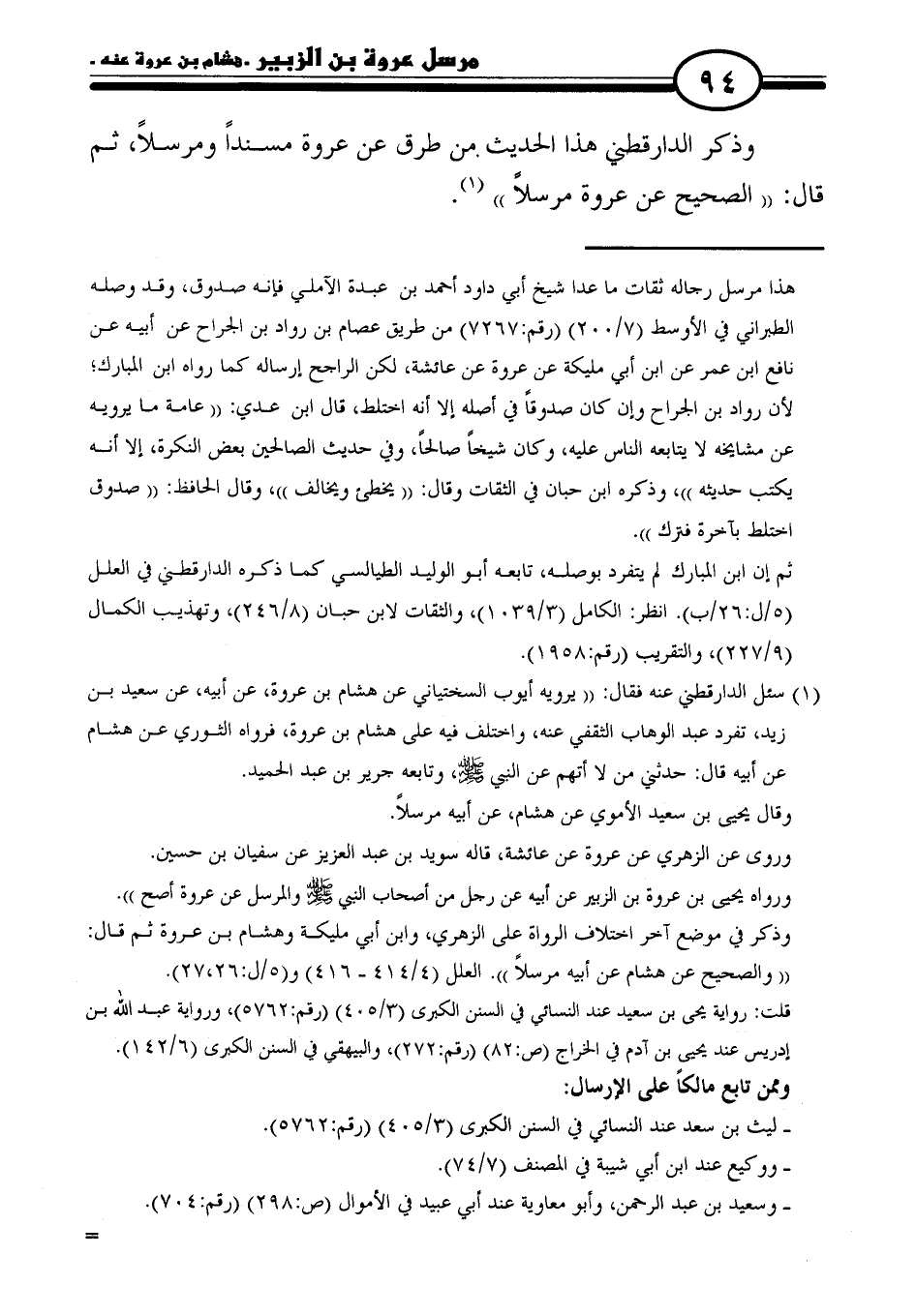 وذكر في موضع آخر اختلاف الرواة على الزهريّ، وابن أبي مليكة وهشام بن عروة ثم قال: "والصحيح عن هشام عن أبيه مرسلًا". العلل (٤/ ٤١٤ - ٤١٦) و (٥ / ل: ٢٦، ٢٧).