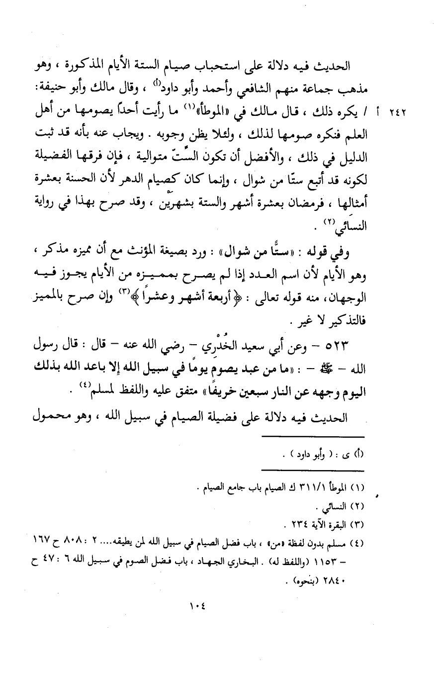 (¬4) مسلم بدون لفظة "من"، باب فضل الصيام في سبيل الله لمن يطيقه .... 2: 808 ح 167 - 1153 (واللفظ له). البخاري الجهاد، باب فضل الصوم في سبيل الله 6: 47 ح 2840 (بنحوه).