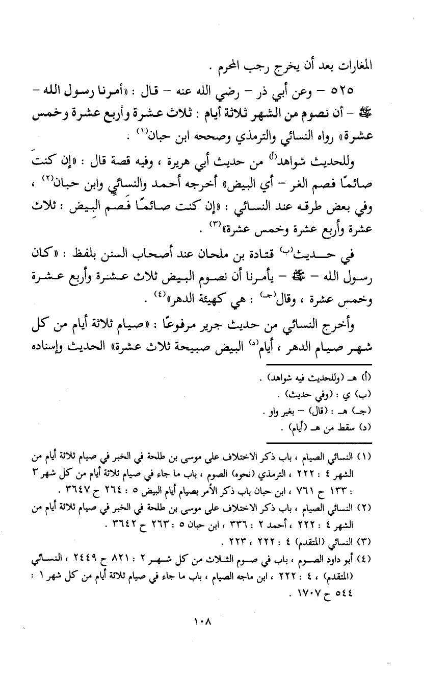 525 - وعن أبي ذر - رضي الله عنه - قال: "أمرنا رسول الله - صلى الله عليه وسلم - أن نصوم من الشهر ثلاثة أيام: ثلاث عشرة وأربع عشرة وخمس عشرة" رواه النسائي والترمذي وصححه ابن حبان (¬1).