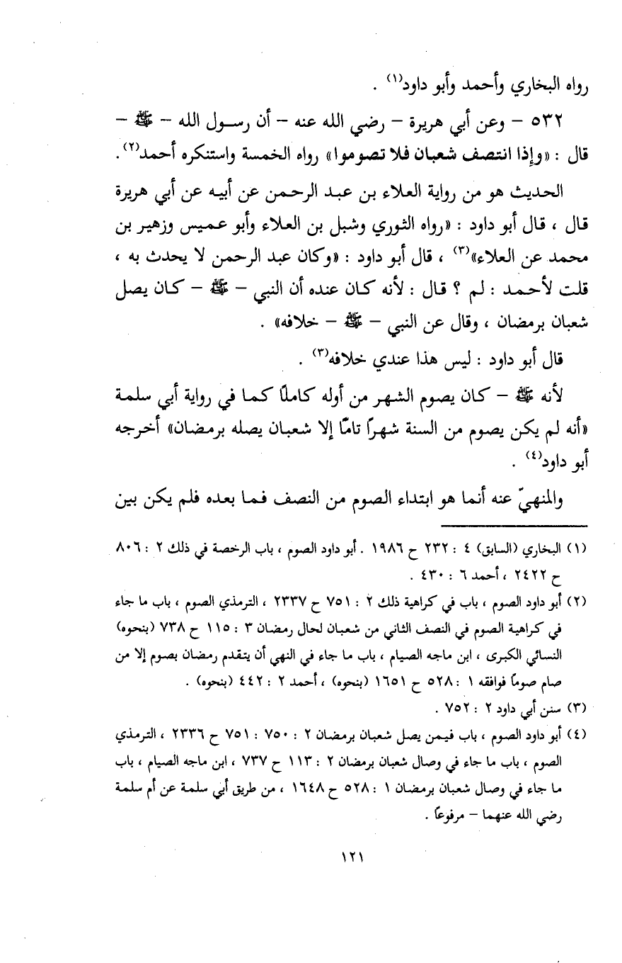 532 - وعن أبي هريرة - رضي الله عنه - أن رسول الله - صلى الله عليه وسلم - قال: "وإِذا انتصف شعبان فلا تصوموا" رواه الخمسة واستنكره أحمد (¬2).