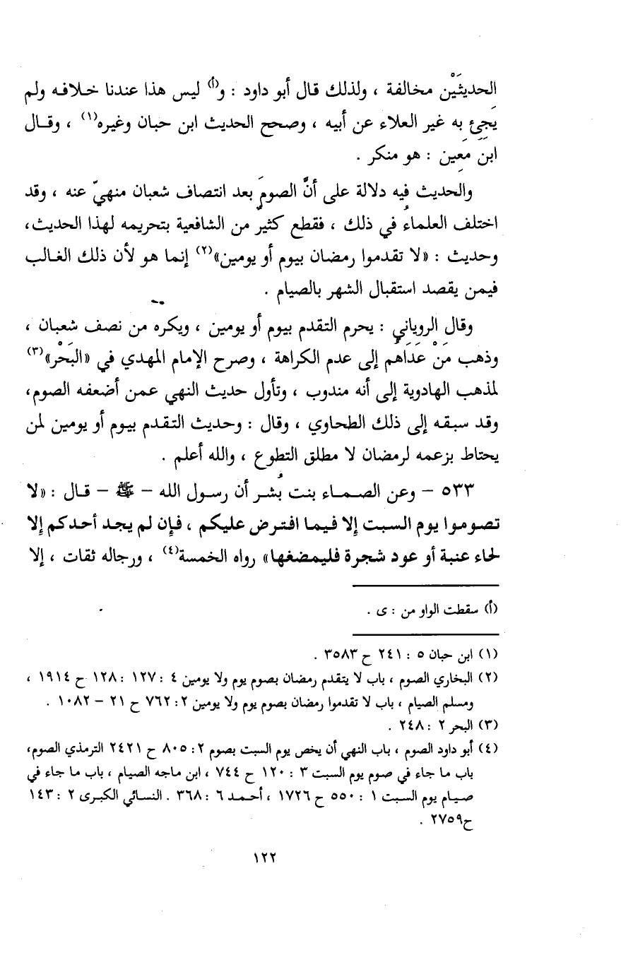 (¬4) أبو داود الصوم، باب النهي أن يخص يوم السبت بصوم 2: 805 ح 2421 الترمذي الصوم، باب ما جاء في صوم يوم السبت 3: 120 ح 744، ابن ماجه الصيام، باب ما جاء في صيام يوم السبت 1: 550 ح 1726، أحمد 6: 368. النسائي الكبرى 2: 143 ح 2759.