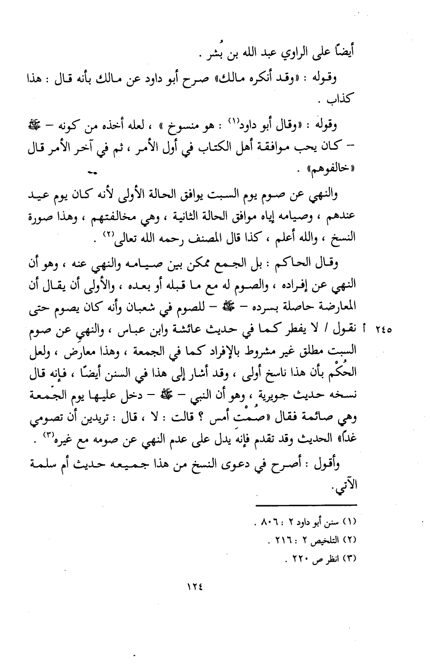 والنهي عن صوم يوم السبت يوافق الحالة الأولى لأنه كان يوم عيد عندهم، وصيامه إياه موافق الحالة الثانية، وهي مخالفتهم، وهذا صورة النسخ، والله أعلم، كذا قال المصنف رحمه الله تعالى (¬2).