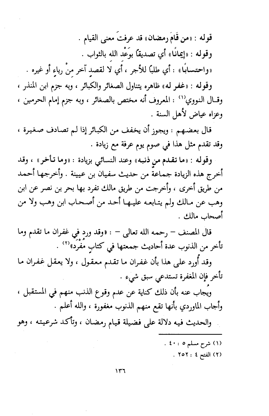 وقوله: "ما تقدم من ذنبه" وعند النسائي بزيادة: "وما تأخر"، وقد أخرج هذه الزيادة جماعةٌ من حديث سفيان بن عيينة. وأخرجها أحمد من طريق أخرى، وأخرجت من طريق مالك تفرد بها بحر بن نصر عن ابن وهب عن مالك ولم يتابعه عليها أحد من أصحاب ابن وهب ولا من أصحاب مالك.