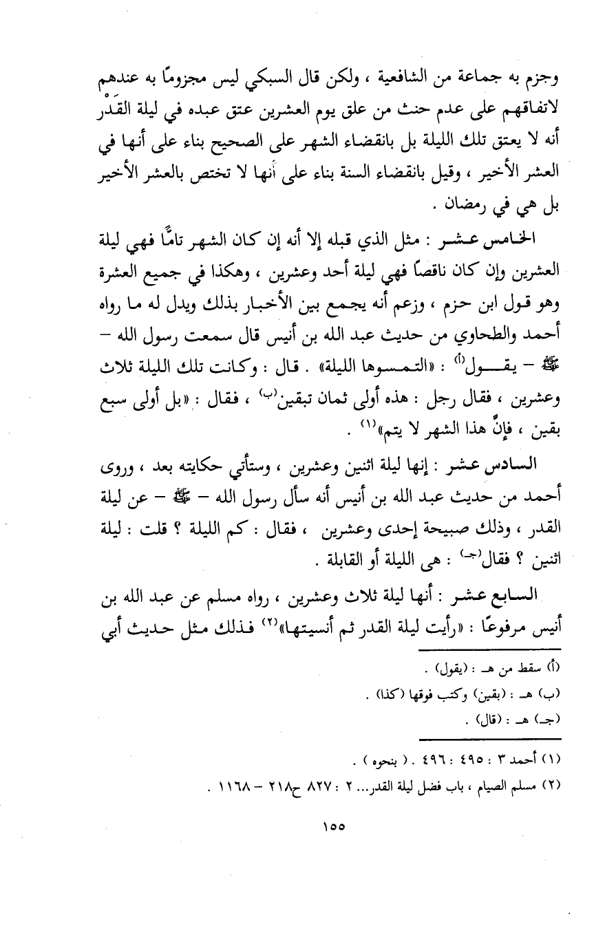 الخامس عشر: مثل الذي قبله إلا أنه إن كان الشهر تامًّا فهي ليلة العشرين وإن كان ناقصًا فهي ليلة أحد وعشرين، وهكذا في جميع العشرة وهو قول ابن حزم، وزعم أنه يجمع بين الأخبار بذلك ويدل له ما رواه أحمد والطحاوي من حديث عبد الله بن أنيس قال سمعت رسول الله - صلى الله عليه وسلم - يقول (أ): "التمسوها الليلة". قال: وكانت تلك الليلة ثلاث وعشرين، فقال رجل: هذه أولى ثمان تبقين (ب)، فقال: "بل أولى سبع بقين، فإنَّ هذا الشهر لا يتم" (¬1).