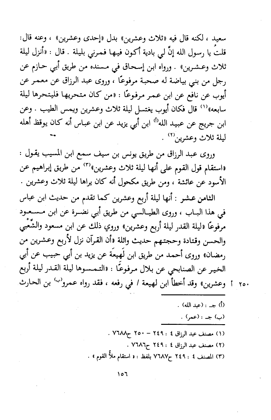 وروى عبد الرزاق من طريق يونس بن سيف سمع ابن المسيب يقول: "استقام قول القوم على أنها ليلة ثلاث وعشرين" (¬3) من طريق إبراهيم عن الأسود عن عائشة، ومن طريق مكحول أنه كان يراها ليلة ثلاث وعشرين.