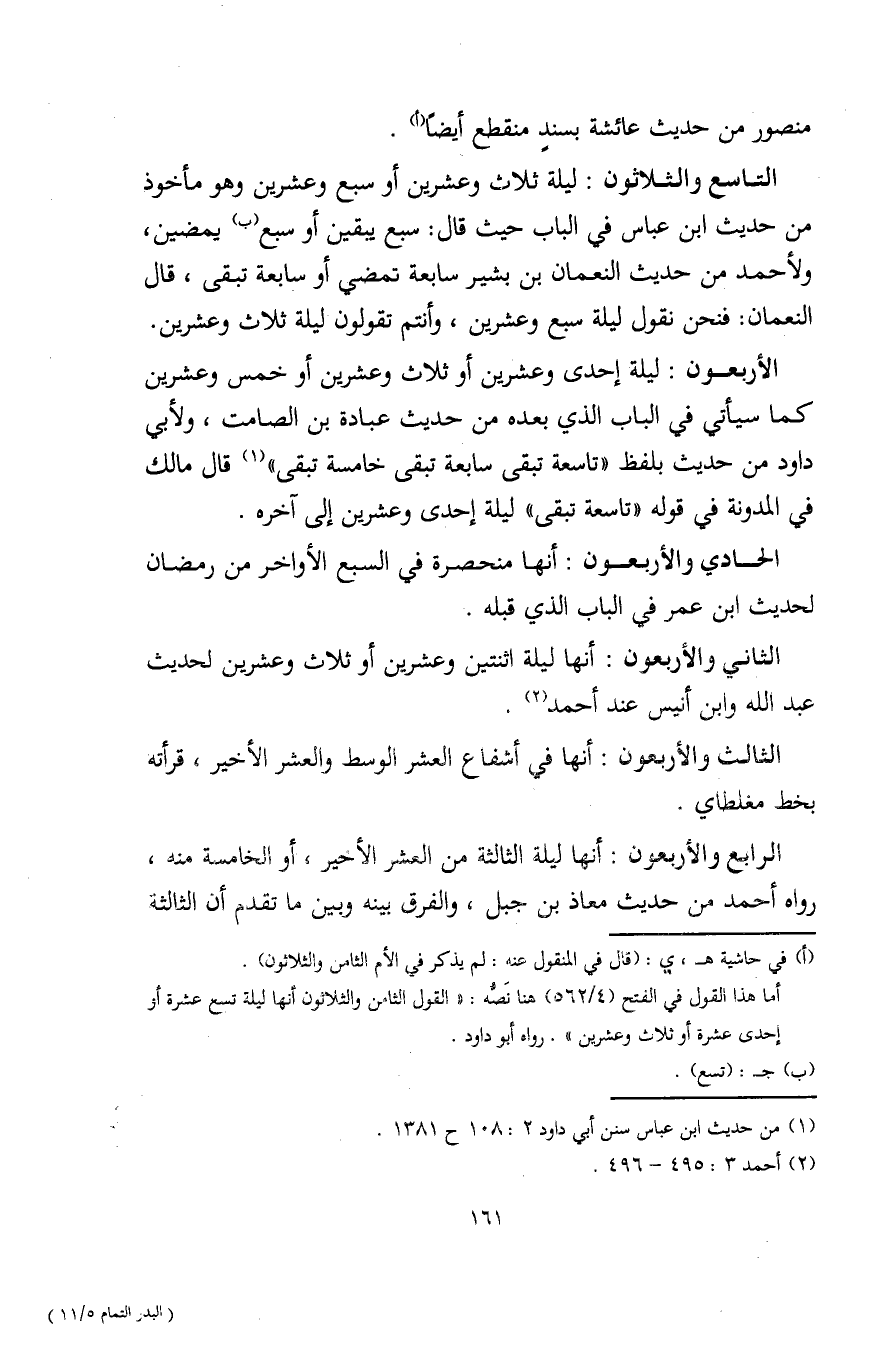 الأربعون: ليلة إحدى وعشرين أو ثلاث وعشرين أو خمس وعشرين كما سيأتي في الباب الذي بعده من حديث عبادة بن الصامت، ولأبي داود من حديث بلفظ "تاسعة تبقى سابعة تبقى خامسة تبقى" (¬1) قال مالك في المدونة في قوله "تاسعة تبقى" ليلة إحدى وعشرين إلى آخره.