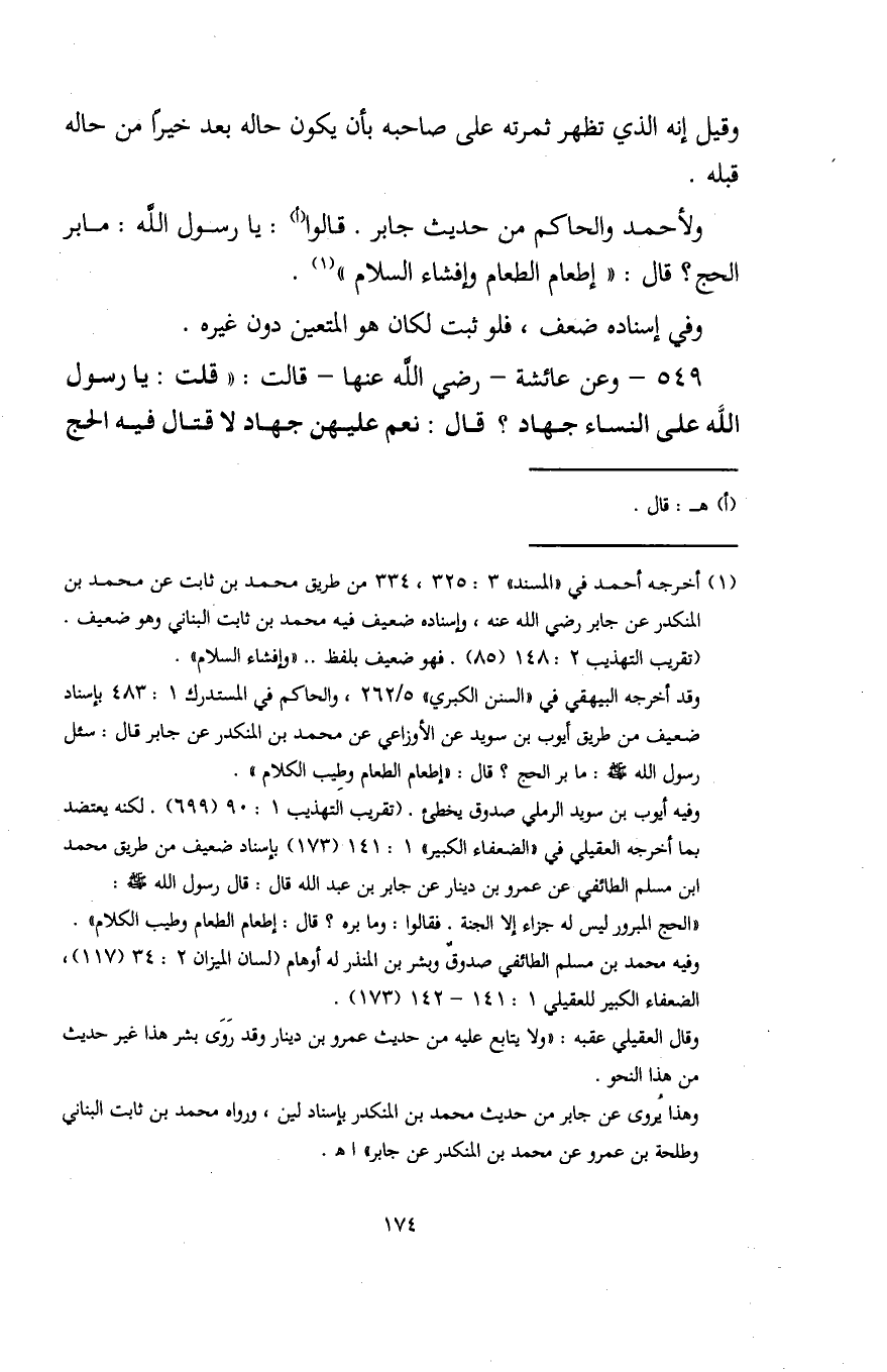 549 - وعن عائشة - رضي الله عنها - قالت: "قلت: يا رسول اللَّه على النساء جهاد؟ قال: نعم عليهن جهاد لا قتال فيه الحج