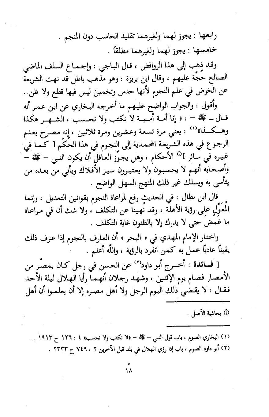 قال ابن بطال: في الحديث رفع لمراعاة النجوم بقوانين التعديل، وإنما المُعَوّل على رؤية الأهلة، وقد نُهينا عن التكلف، ولا شك أن في مراعاة ما غَمُض حتى لا يدرك إلا بالظنون غاية التكلف.