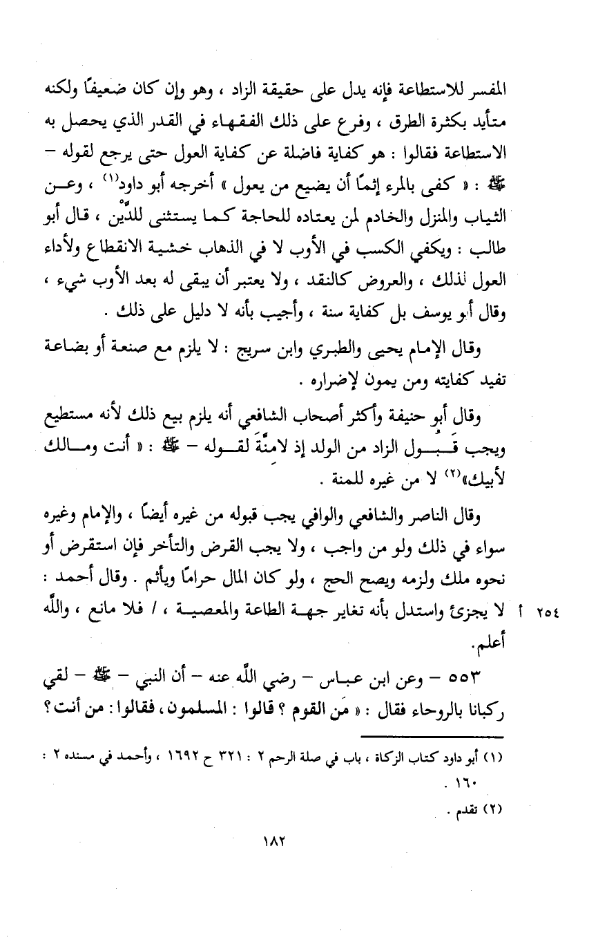 المفسر للاستطاعة فإنه يدل على حقيقة الزاد، وهو وإن كان ضعيفًا ولكنه متأيد بكثرة الطرق، وفرع على ذلك الفقهاء في القدر الذي يحصل به الاستطاعة فقالوا: هو كفاية فاضلة عن كفاية العول حتى يرجع لقوله - صلى الله عليه وسلم -: "كفى بالمرء إثمًا أن يضيع من يعول" أخرجه أبو داود (¬1)، وعن الثياب والمنزل والخادم لمن يعتاده للحاجة كما يستثنى للدَّيْن، قال أبو طالب: ويكفي الكسب في الأوب لا في الذهاب خشية الانقطاع ولأداء العول لذلك، والعروض كالنقد، ولا يعتبر أن يبقى له بعد الأوب شيء، وقال أبو يوسف بل كفاية سنة، وأجيب بأنه لا دليل على ذلك.