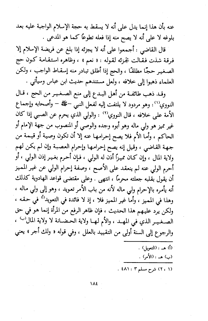 وقد ذهب طائفة من أهل البدع إلى منع الصغير من الحج، قال النووي (¬1): وهو مردود لا يلتفت إليه لفعل النبي - صلى الله عليه وسلم - وأصحابه وإجماع الأمة على خلافه، قال النووي (¬2): والولي الذي يحرم عن الصبي إذا كان غير مميز هو ولي ماله وهو أبوه وجده والوصي أو المنصوب من جهة الإمام أو الحاكم، وأما الأم فلا يصح إحرامها عنه إلا أن تكون وصية أو قيمة من جهة القاضي، وقيل إنه يصح إحرامها وإحرام العصبة وإن لم يكن لهم ولاية المال، وإن كان مميزًا أذن له الولي، فإن أحرم بغير إذن الولي، أو أحرم الولي عنه لم ينعقد علي الأصح، وصفه إحرام الولي عن غير المميز أن يقول بقلبه جعلته محرمًا، انتهى. وعلى مقتضى قواعد الهادوية كذلك أنه يأمره بالإحرام ولي ماله لأنه من باب الأمر تعويد، وهو إلى ولي ماله، وهذا في المميز، وأما غير المميز فلا، إذ لا فائدة في التعويد (أ) في حقه، ولكن يرد عليهم هذا الحديث، فإن ظاهر الرفع من المرأة إنما هو في حق الصغير الذي في المهد، والأم لها ولاية الحضانة لا ولاية المال (ب)، والرجوع إلى السنة أولى من التقييد بالعلل، وفي قوله "ولك أجر" يعني