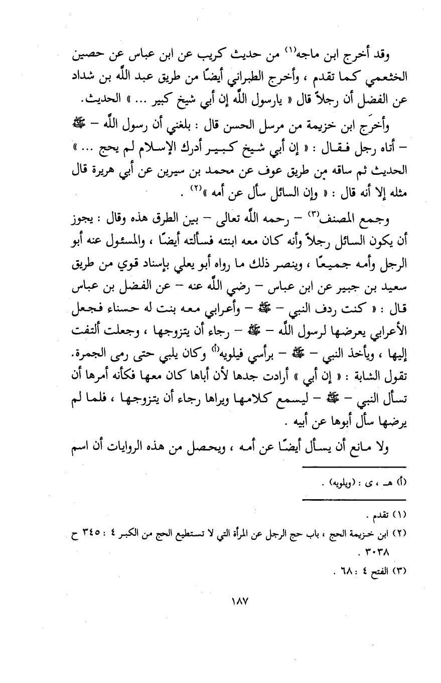 وأخرَج ابن خزيمة من مرسل الحسن قال: بلغني أن رسول الله - صلى الله عليه وسلم - أتاه رجل فقال: "إن أبي شيخ كبير أدرك الإسلام لم يحج ... " الحديث ثم ساقه من طريق عوف عن محمد بن سيرين عن أبي هريرة قال مثله إلا أنه قال: "وإن السائل سأل عن أمه" (¬2).