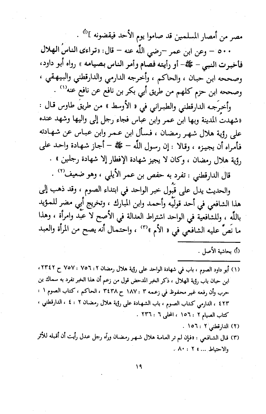 (¬1) أبو داود الصوم، باب في شهادة الواحد على رؤية هلال رمضان 2: 756: 757 ح 2342، ابن حبان باب رؤية الهلال، ذكر الخبر المدحض قول من زعم أن هذا الخبر تفرد به سماك بن حرب وأن رفعه غير محفوظ في زعمه 3: 187 ح 3438، الحاكم، كتاب الصوم 1: 423، الدارمي كتاب الصوم، باب الشهادة على رؤية هلال رمضان 2: 4، الدارقطني، كتاب الصيام 2: 156، المحلى 6: 236.