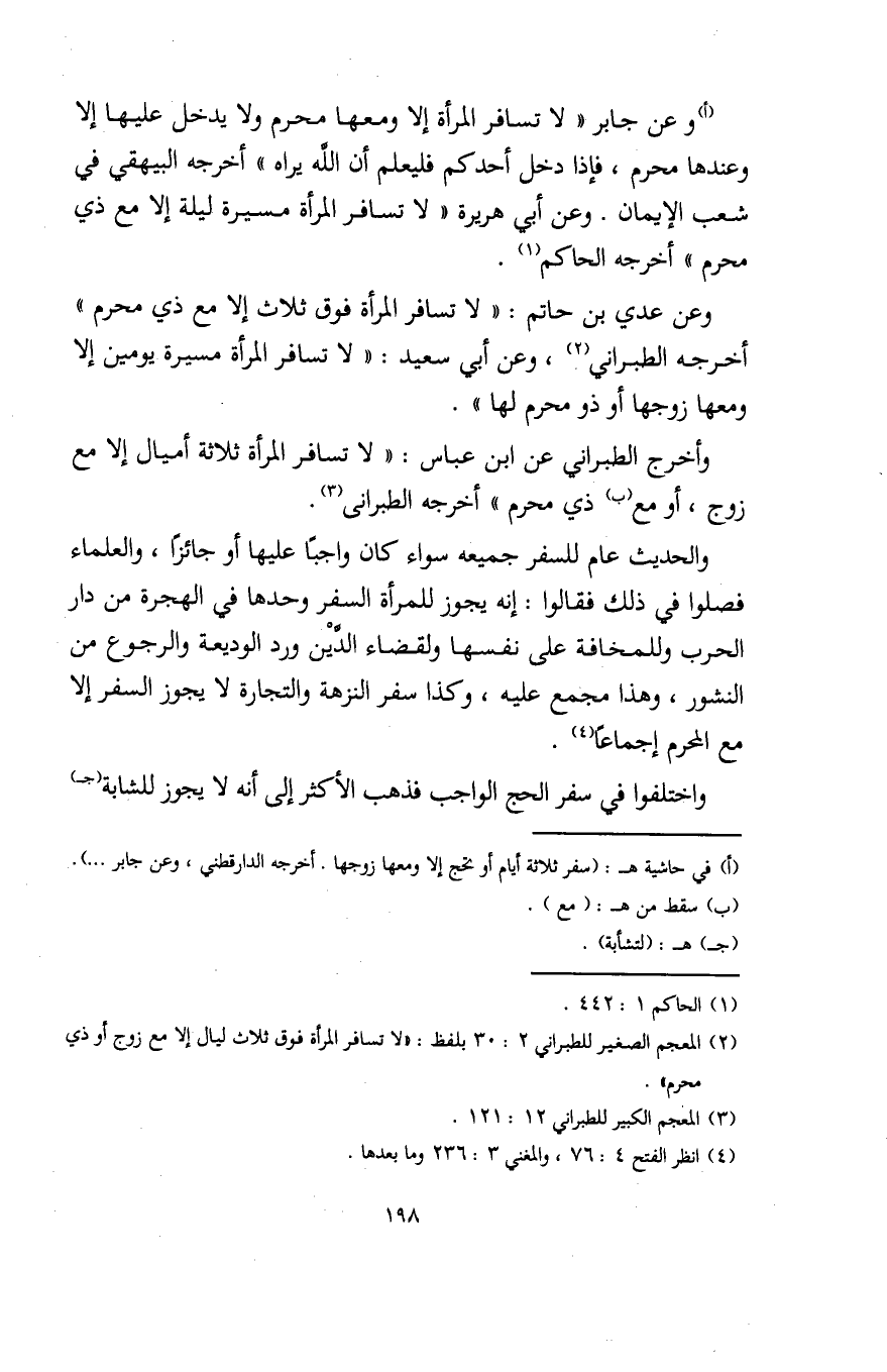 (أ) وعن جابر "لا تسافر المرأة إلا ومعها محرم ولا يدخل عليها إلا وعندها محرم، فإذا دخل أحدكم فليعلم أن الله يراه" أخرجه البيهقي في شعب الإيمان. وعن أبي هريرة "لا تسافر المرأة مسيرة ليلة إلا مع ذي محرم" أخرجه الحاكم (¬1).
