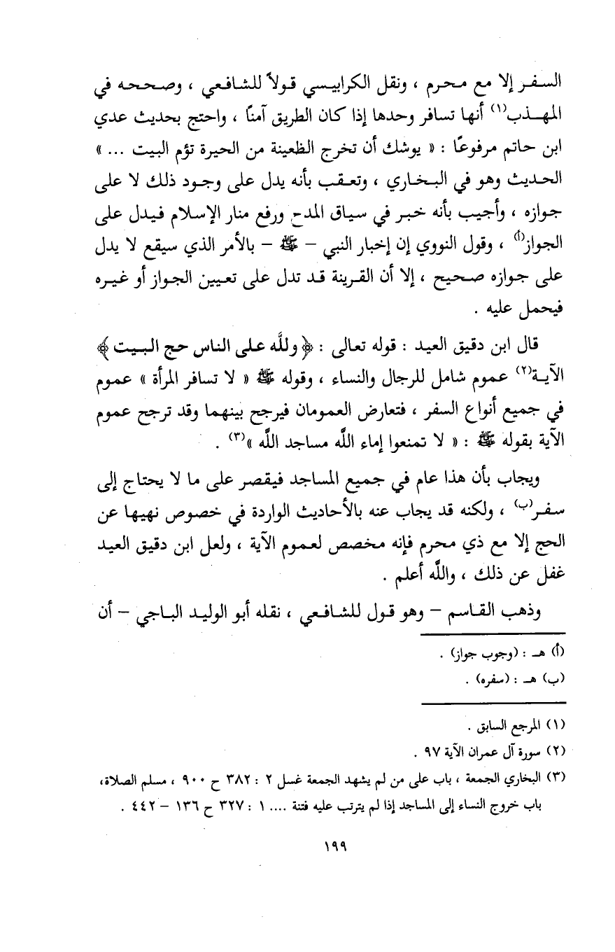 ويجاب بأن هذا عام في جميع المساجد فيقصر على ما لا يحتاج إلى سفر (ب)، ولكنه قد يجاب عنه بالأحاديث الواردة في خصوص نهيها عن الحج إلا مع ذي محرم فإنه مخصص لعموم الآية، ولعل ابن دقيق العيد غفل عن ذلك، والله أعلم.