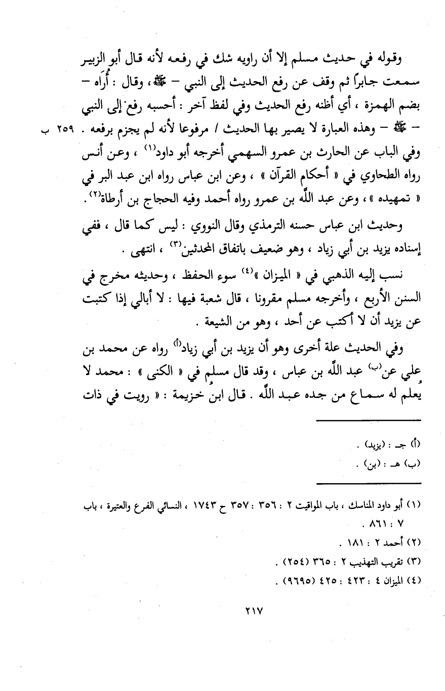 وفي الحديث علة أخرى وهو أن يزيد بن أبي زياد (أ) رواه عن محمد بن علي عن (ب) عبد الله بن عباس، وقد قال مسلم في "الكنى": محمد لا يُعلم له سماع من جده عبد الله. قال ابنُ خزيمة: "رويت في ذات