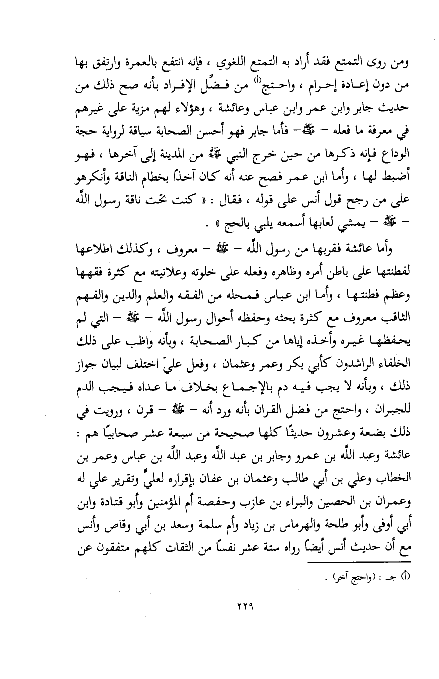 ومن روى التمتع فقد أراد به التمتع اللغوي، فإنه انتفع بالعمرة وارتفق بها من دون إعادة إحرام، واحتج (أ) من فضَّل الإفراد بأنه صح ذلك من حديث جابر وابن عمر وابن عباس وعائشة، وهؤلاء لهم مزية على غيرهم في معرفة ما فعله - صلى الله عليه وسلم - فأما جابر فهو أحسن الصحابة سياقة لرواية حجة الوداع فإنه ذكرها من حين خرج النبي - صلى الله عليه وسلم - من المدينة إلى آخرها، فهو أضبط لها، وأما ابن عمر فصح عنه أنه كان آخذًا بخطام الناقة وأنكر هو على من رجح قول أنس على قوله، فقال: "كنت تحت ناقة رسول الله - صلى الله عليه وسلم - يمشي لعابها أسمعه يلبي بالحج".