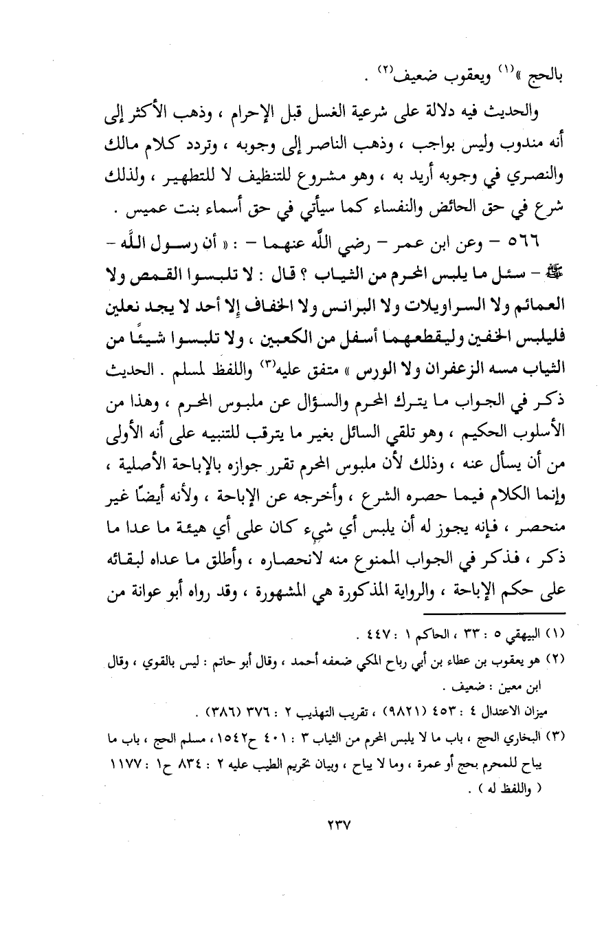 566 - وعن ابن عمر - رضي الله عنهما -: "أن رسول الله - صلى الله عليه وسلم - سئل ما يلبس المحرم من الثياب؟ قال: لا تلبسوا القمص ولا العمائم ولا السراويلات ولا البرانس ولا الخفاف إِلا أحد لا يجد نعلين فليلبس الخفين وليقطعهما أسفل من الكعبين، ولا تلبسوا شيئًا من الثياب مسه الزعفران ولا الورس" متفق عليه (¬3) واللفظ لمسلم. الحديث ذكر في الجواب ما يترك المحرم والسؤال عن ملبوس المحرم، وهذا من الأسلوب الحكيم، وهو تلقي السائل بغير ما يترقب للتنبيه على أنه الأولى من أن يسأل عنه، وذلك لأن ملبوس المحرم تقرر جوازه بالإباحة الأصلية، وإنما الكلام فيما حصره الشرع، وأخرجه عن الإباحة، ولأنه أيضًا غير منحصر، فإنه يجوز له أن يلبس أي شيء كان على أي هيئة ما عدا ما ذكر، فذكر في الجواب الممنوع منه لانحصاره، وأطلق ما عداه لبقائه على حكم الإباحة، والرواية المذكورة هي المشهورة، وقد رواه أبو عوانة من