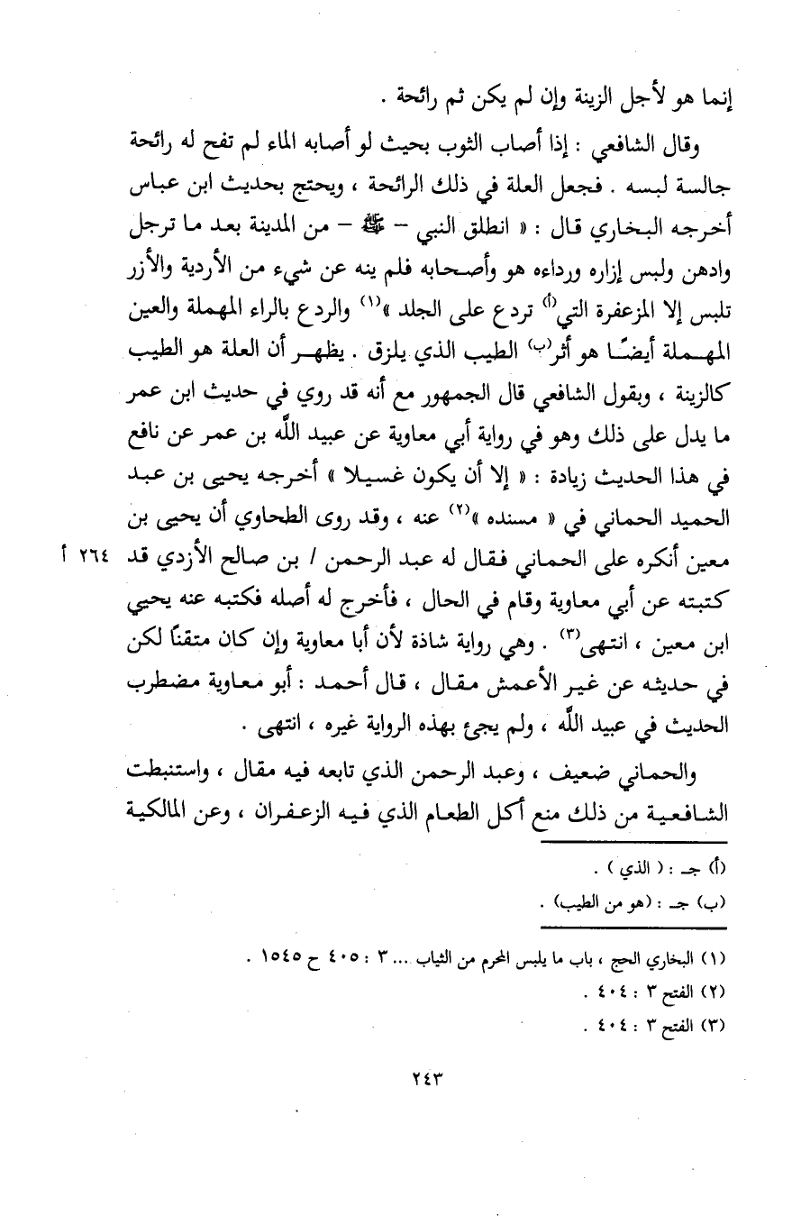 والحماني ضعيف، وعبد الرحمن الذي تابعه فيه مقال، واستنبطت الشافعية من ذلك منع أكل الطعام الذي فيه الزعفران، وعن المالكية