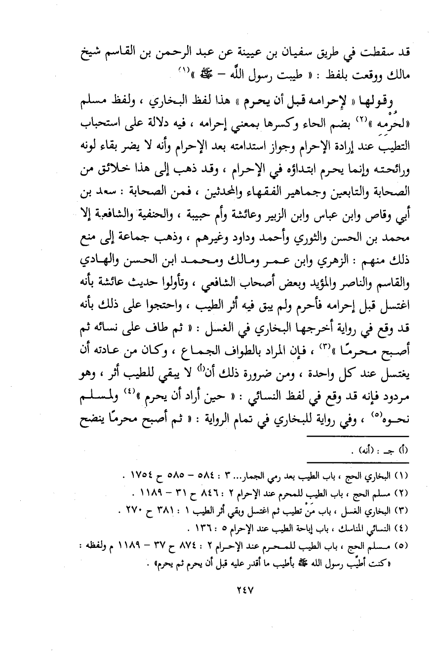 (¬5) مسلم الحج، باب الطيب للمحرم عند الإحرام 2: 874 ح 37 - 1189 م ولفظه: "كنت أطيّب رسول الله - صلى الله عليه وسلم - بأطيب ما أقدر عليه قبل أن يحرم ثم يحرم".