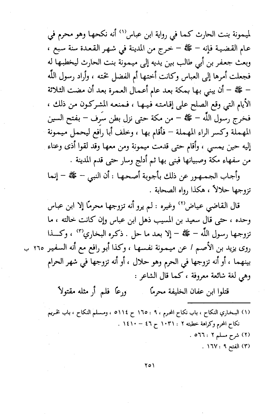 قال القاضي عياض (¬2) وغيره: لم يرو أنه تزوجها محرمًا إلا ابن عباس وحده، حتى قال سعيد بن المسيب ذهل ابن عباس وإن كانت خالته، ما تزوجها رسول الله - صلى الله عليه وسلم - إلا بعد ما حل. ذكره البخاري (¬3)، وكذا روى يزيد بن الأصم عن ميمونة نفسها، وكذا أبو رافع مع أنه السفير بينهما، أو أنه تزوجها في الحرم وهو حلال، أو أنه تزوجها في شهر الحرام وهي لغة شائعة معروفة، كما قال الشاعر: