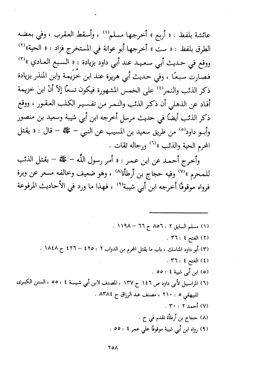 وأخرج أحمد عن ابن عمر: "أمر رسول الله - صلى الله عليه وسلم - بقتل الذئب للمحرم" (¬7) وفيه حجاج بن أرطأة (¬8)، وهو ضعيف وخالفه مسعر عن وبرة فرواه موقوفًا أخرجه ابن أبي شيبة (¬9)، فهذا ما ورد في الأحاديث المرفوعة