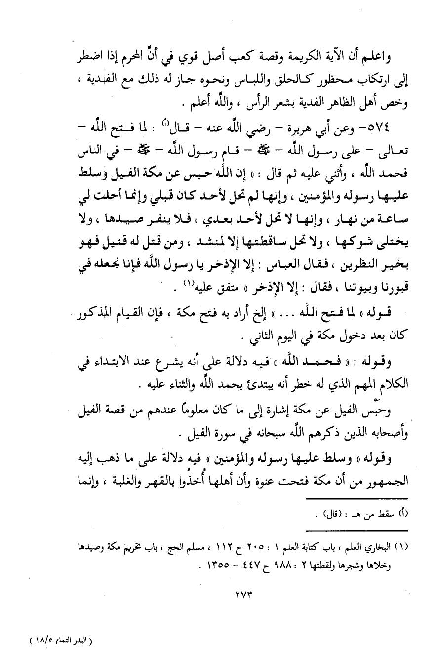 574 - وعن أبي هريرة - رضي الله عنه - قال (أ): لما فتح الله -تعالى- على رسول الله - صلى الله عليه وسلم - قام رسول الله - صلى الله عليه وسلم - في الناس فحمد الله، وأثنى عليه ثم قال: "إِن اللَّه حبس عن مكة الفيل وسلط عليها رسوله والمؤمنين، وإِنها لم تحل لأحد كان قبلي وإنما أحلت لي ساعة من نهار، وإِنها لا تحل لأحد بعدي، فلا ينفر صيدها، ولا يختلى شوكها، ولا تحل ساقطتها إِلا لمنشد، ومن قتل له قتيل فهو بخير النظرين، فقال العباس: إِلا الإِذخر يا رسول اللَّه فإِنا نجعله في قبورنا وبيوتنا، فقال: إِلا الإِذخر" متفق عليه (¬1).
