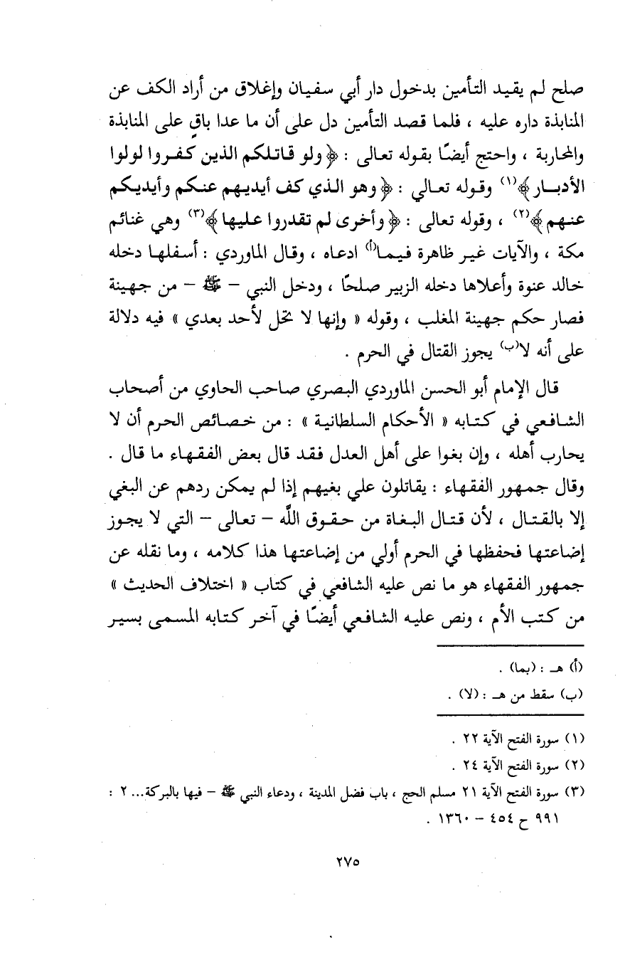 قال الإمام أبو الحسن الماوردي البصري صاحب الحاوي من أصحاب الشافعي في كتابه "الأحكام السلطانية": من خصائص الحرم أن لا يحارب أهله، وإن بغوا على أهل العدل فقد قال بعض الفقهاء ما قال.