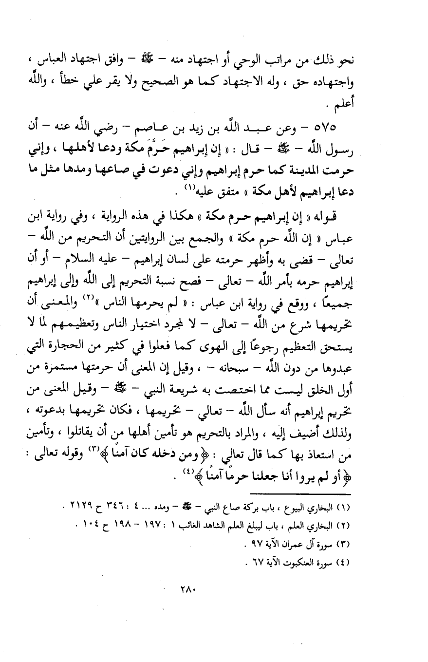 575 - وعن عبد الله بن زيد بن عاصم - رضي الله عنه - أن رسول الله - صلى الله عليه وسلم - قال: "إِن إبراهيم حَرَّمَ مكة ودعا لأهلها، وإِني حرمت المدينة كما حرم إبراهيم وإِني دعوت في صاعها ومدها مثل ما دعا إِبراهيم لأهل مكة" متفق عليه (¬1).