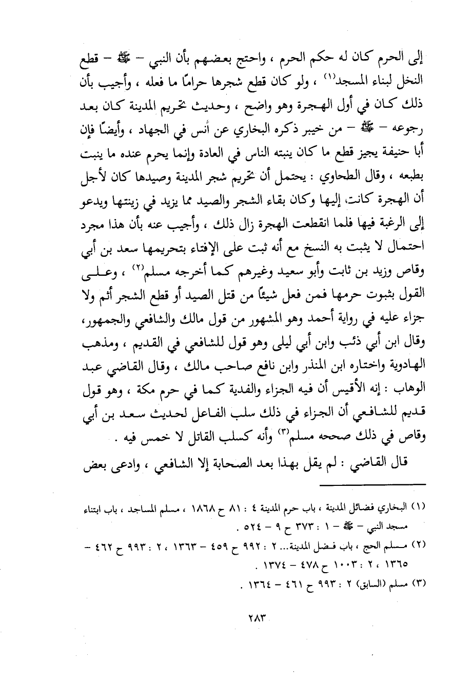 إلى الحرم كان له حكم الحرم، واحتج بعضهم بأن النبي - صلى الله عليه وسلم - قطع النخل لبناء المسجد (¬1)، ولو كان قطع شجرها حرامًا ما فعله، وأجيب بأن ذلك كان في أول الهجرة وهو واضح، وحديث تحريم المدينة كان بعد رجوعه - صلى الله عليه وسلم - من خيبر ذكره البخاري عن أنس في الجهاد، وأيضًا فإن أبا حنيفة يجيز قطع ما كان ينبته الناس في العادة وإنما يحرم عنده ما ينبت بطبعه، وقال الطحاوي: يحتمل أن تحريم شجر المدينة وصيدها كان لأجل أن الهجرة كانت، إليها وكان بقاء الشجر والصيد مما يزيد في زينتها ويدعو إلى الرغبة فيها فلما انقطعت الهجرة زال ذلك، وأجيب عنه بأن هذا مجرد احتمال لا يثبت به النسخ مع أنه ثبت على الإفتاء بتحريمها سعد بن أبي وقاص وزيد بن ثابت وأبو سعيد وغيرهم كما أخرجه مسلم (¬2)، وعلى القول بثبوت حرمها فمن فعل شيئًا من قتل الصيدأو قطع الشجر أثم ولا جزاء عليه في روايه أحمد وهو المشهور من قول مالك والشافعي والجمهور، وقال ابن أبي ذئب وابن أبي ليلى وهو قول للشافعي في القديم، ومذهب الهادوية واختاره ابن المنذر وابن نافع صاحب مالك، وقال القاضي عبد الوهاب: إنه الأقيس أن فيه الجزاء والفدية كما في حرم مكة، وهو قول قديم للشافعي أن الجزاء في ذلك سلب الفاعل لحديث سعد بن أبي وقاص في ذلك صححه مسلم (¬3) وأنه كسلب القاتل لا خمس فيه.