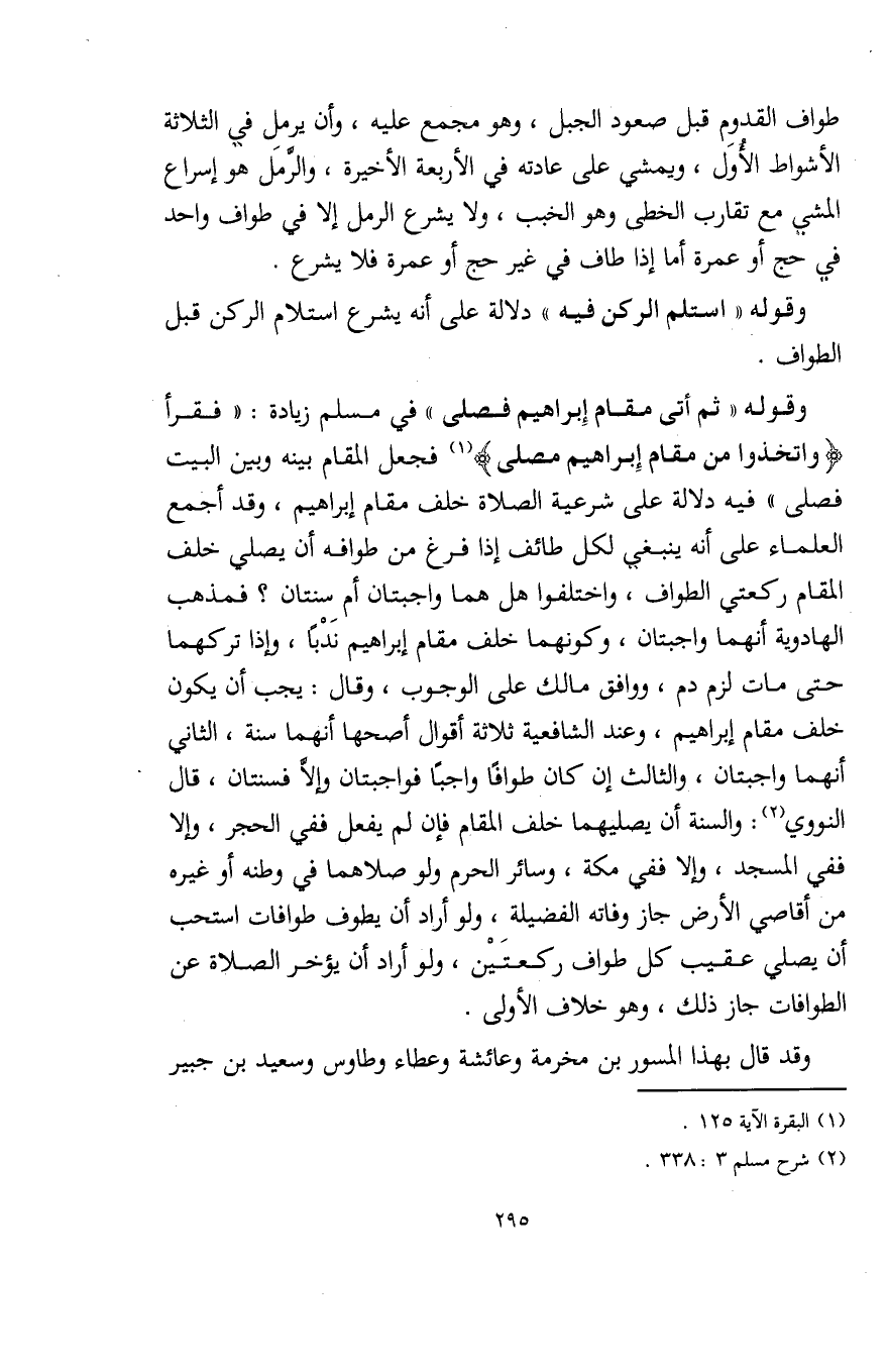 وقوله "ثم أتى مقام إِبراهيم فصلى" في مسلم زيادة: "فقرأ {واتخذوا من مقام إِبراهيم مصلى} (¬1) فجعل المقام بينه وبين البيت فصلى" فيه دلالة على شرعية الصلاة خلف مقام إبراهيم، وقد أجمع العلماء على أنه ينبغي لكل طائف إذا فرغ من طوافه أن يصلي خلف المقام ركعتي الطواف، واختلفوا هل هما واجبتان أم سنتان؟ فمذهب الهادوية أنهما واجبتان، وكونهما خلف مقام إبراهيم نَدْبًا، وإذا تركهما حتى مات لزم دم، ووافق مالك على الوجوب، وقال: يجب أن يكون خلف مقام إبراهيم، وعند الشافعية ثلاثة أقوال أصحها أنهما سنة، الثاني أنهما واجبتان، والثالث إن كان طوافًا واجبًا فواجبتان وإلا فسنتان، قال النووي (¬2): والسنة أن يصليهما خلف المقام فإن لم يفعل ففي الحجر، وإلا ففي المسجد، وإلا ففي مكة، وسائر الحرم ولو صلاهما في وطنه أو غيره من أقاصي الأرض جاز وفاته الفضيلة، ولو أراد أن يطوف طوافات استحب أن يصلي عقيب كل طواف ركعتَيْن، ولو أراد أن يؤخر الصلاة عن الطوافات جاز ذلك، وهو خلاف الأولى.