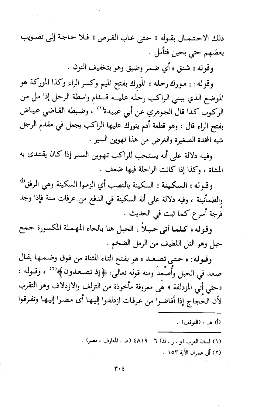 وقوله "السكينة" السكينة بالنصب أي الزموا السكينة وهي الرفق (أ) والطمأنينة، وفيه دلالة على أنه السكينة في الدفع من عرفات سنة فإذا وجد فُرجة أسرع كما ثبت في الحديث.
