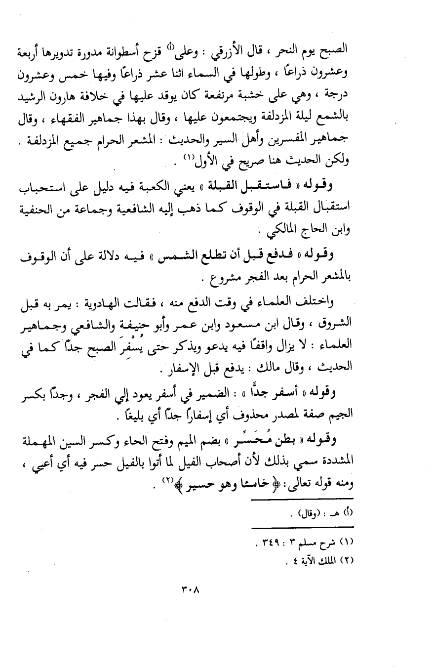 الصبح يوم النحر، قال الأزرقي: وعلى (أ) قزح أسطوانة مدورة تدويرها أربعة وعشرون ذراعًا، وطولها في السماء اثنا عشر ذراعًا وفيها خمس وعشرون درجة، وهي على خشبة مرتفعة كان يوقد عليها في خلافة هارون الرشيد بالشمع ليلة المزدلفة ويجتمعون عليها، وقال بهذا جماهير الفقهاء، وقال جماهير المفسرين وأهل السير والحديث: المشعر الحرام جميع المزدلفة. ولكن الحديث هنا صريح في الأول (¬1).
