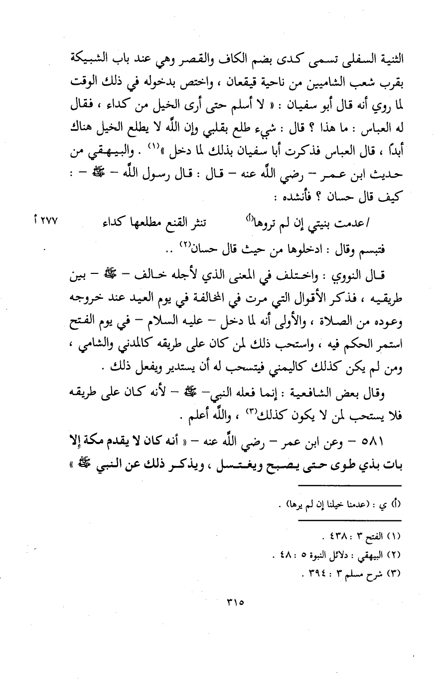 الثنية السفلى تسمى كدى بضم الكاف والقصر وهي عند باب الشبيكة بقرب شعب الشاميين من ناحية قيقعان، واختص بدخوله في ذلك الوقت لما روي أنه قال أبو سفيان: "لا أسلم حتى أرى الخيل من كداء، فقال له العباس: ما هذا؟ قال: شيء طلع بقلبي وإن الله لا يطلع الخيل هناك أبدًا، قال العباس فذكرت أبا سفيان بذلك لما دخل" (¬1). والبيهقي من حديث ابن عمر - رضي الله عنه - قال: قال رسول الله - صلى الله عليه وسلم -: كيف قال حسان؟ فأنشده: