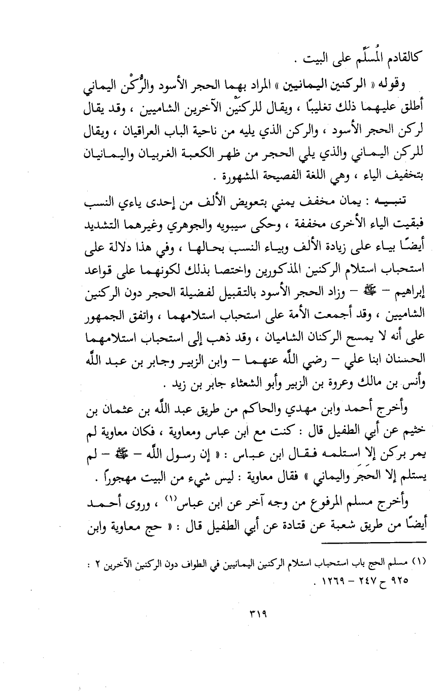 تنبيه: يمان مخفف يمني بتعويض الألف من إحدى ياءي النسب فبقيت الياء الأخرى مخففة، وحكى سيبويه والجوهري وغيرهما التشديد أيضًا بياء على زيادة الألف وبياء النسب بحالها، وفي هذا دلالة على استحباب استلام الركنين المذكورين واختصا بذلك لكونهما على قواعد إبراهيم - صلى الله عليه وسلم - وزاد الحجر الأسود بالتقبيل لفضيلة الحجر دون الركنين الشاميين، وقد أجمعت الأمة على استحباب استلامهما، واتفق الجمهور على أنه لا يمسح الركنان الشاميان، وقد ذهب إلى استحباب استلامهما الحسنان ابنا علي - رضي الله عنهما - وابن الزبير وجابر بن عبد الله وأنس بن مالك وعروة بن الزبير وأبو الشعثاء جابر بن زيد.