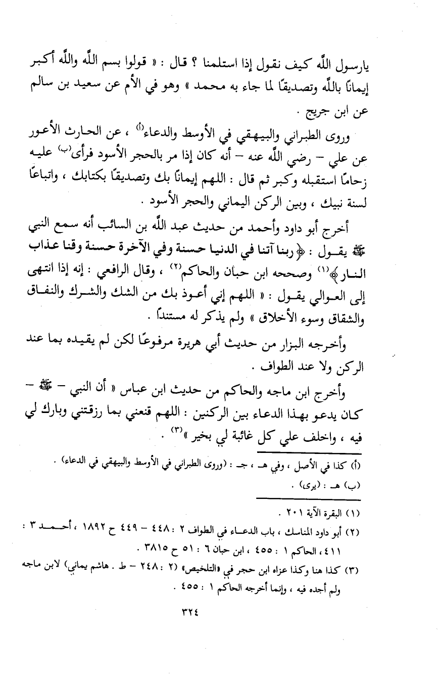 (¬2) أبو داود المناسك، باب الدعاء في الطواف 2: 448 - 449 ح 1892، أحمد 3: 411، الحاكم 1: 455، ابن حبان 6: 51 ح 3815.