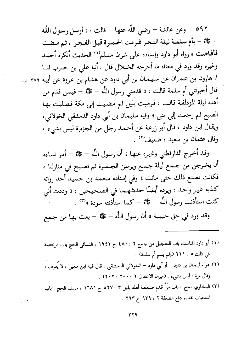 592 - وعن عائشة -رضي الله عنها- قالت: "أرسل رسول اللَّه - صلى الله عليه وسلم - بأم سلمة ليلة النحر فرمت الجمرة قبل الفجر، ثم مضت فأفاضت" رواه أبو داود وإسناده على شرط مسلم (¬1) الحديث أنكره أحمد وغيره وقد ورد في معناه ما أخرجه الخلال قال: أنبا علي بن حرب ثنا هارون بن عمران عن سليمان بن أبي داود عن هشام بن عروة عن أبيه قال أخبرتني أم سلمة قالت: "قدمني رسول الله - صلى الله عليه وسلم - فيمن قدم من أهله ليلة المزدلفة قالت: فرميت بليل ثم مضيت إلى مكة فصليت بها الصبح ثم رجعت إلى منى" وفيه سليمان بن أبي داود الدمشقي الخولاني، ويقال ابن داود، قال أبو زرعة عن أحمد رجل من الجزيرة ليس بشيء، وقال عثمان بن سعيد: ضعيف (¬2).