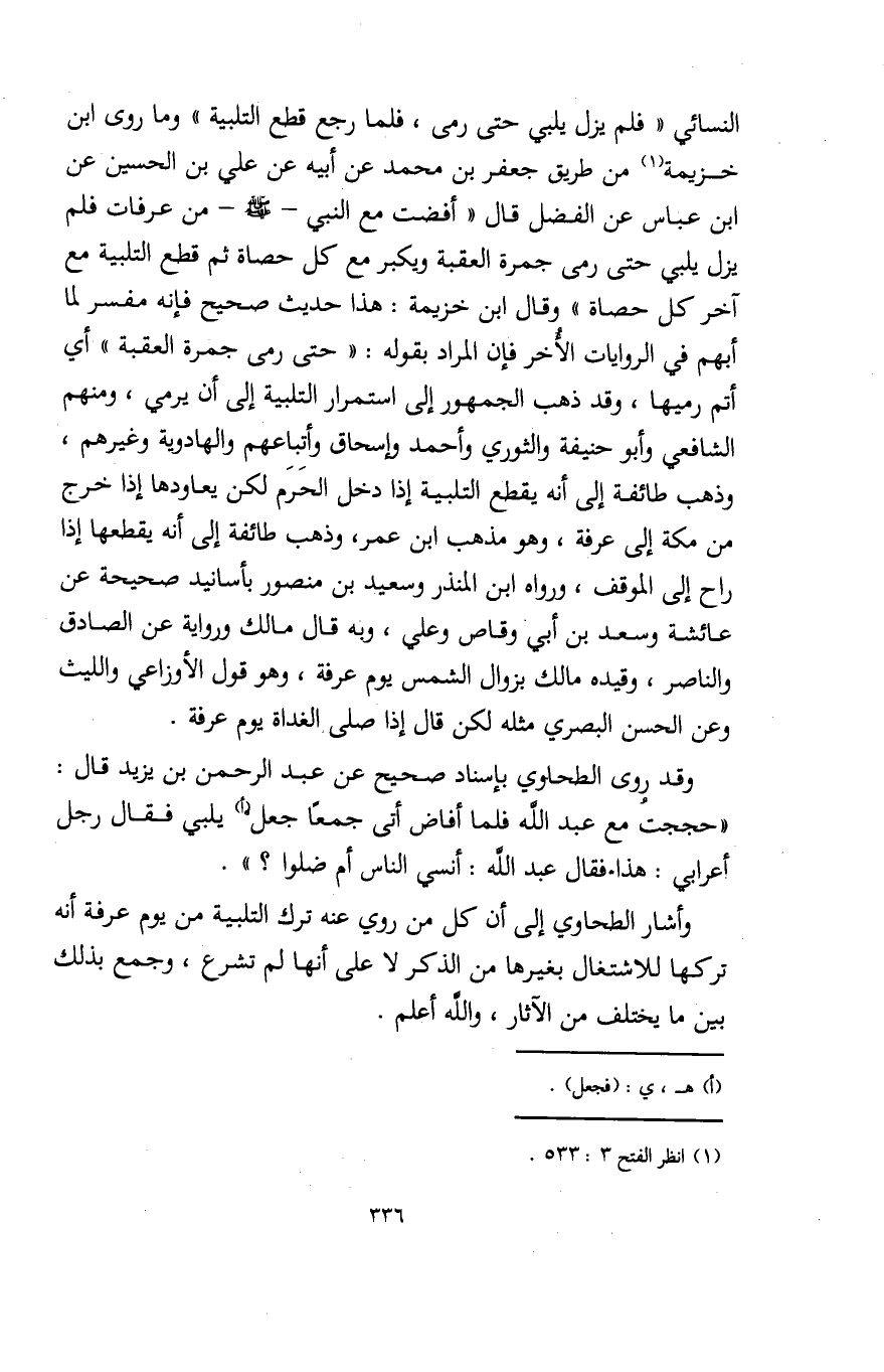 وقد روى الطحاوي بإسناد صحيح عن عبد الرحمن بن يزيد قال: "حججت مع عبد الله فلما أفاض أتى جمعًا جعل (أ) يلبي فقال رجل أعرابي: هذا. فقال عبد الله: أنسي الناس أم ضلوا؟ ".