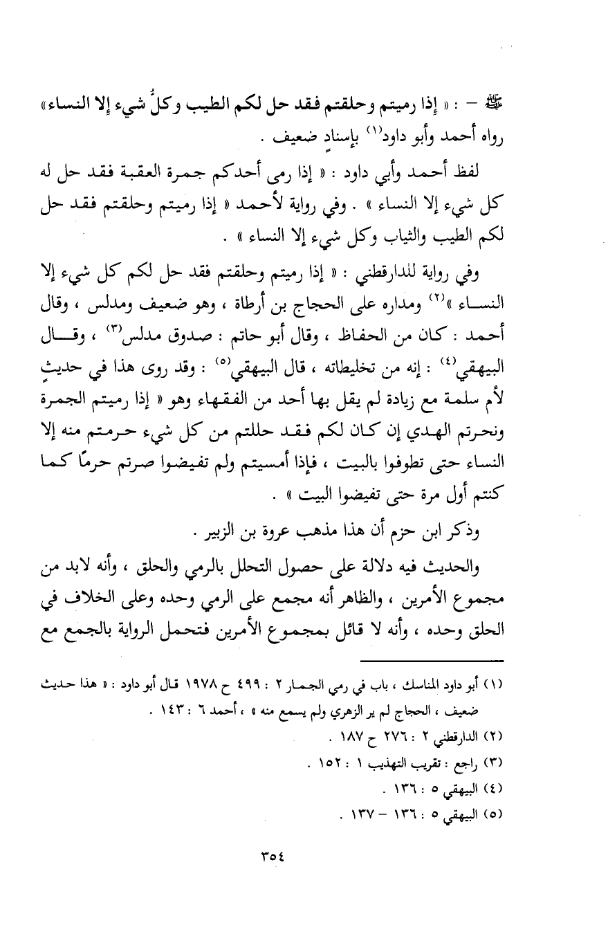 وفي رواية للدارقطني: "إذا رميتم وحلقتم فقد حل لكم كل شيء إلا النساء" (¬2) ومداره على الحجاج بن أرطاة، وهو ضعيف ومدلس، وقال أحمد: كان من الحفاظ، وقال أبو حاتم: صدوق مدلس (¬3)، وقال البيهقي (¬4): إنه من تخليطاته، قال البيهقي (¬5): وقد روى هذا في حديث لأم سلمة مع زيادة لم يقل بها أحد من الفقهاء وهو "إذا رميتم الجمرة ونحرتم الهدي إن كان لكم فقد حللتم من كل شيء حرمتم منه إلا النساء حتى تطوفوا بالبيت، فإذا أمسيتم ولم تفيضوا صرتم حرمًا كما كنتم أول مرة حتى تفيضوا البيت".
